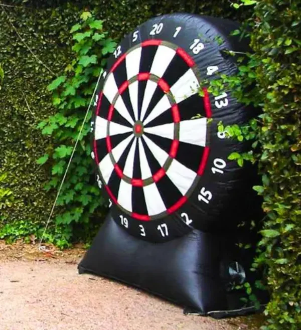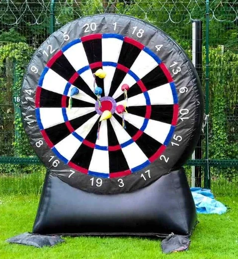 Armé de vos fléchettes ou de votre ballon de foot velcro, visez le centre de la cible gonflable et cumulez les meilleurs points. Agilité, concentration et force seront vos maîtres-mots. Matière : nylon. Diamètre : 2,5m. Capacité maximum : 2 personnes. Âge minimum : 4 ans. 1 prise 220V 16A. Inclus : 6 cônes scratchables.